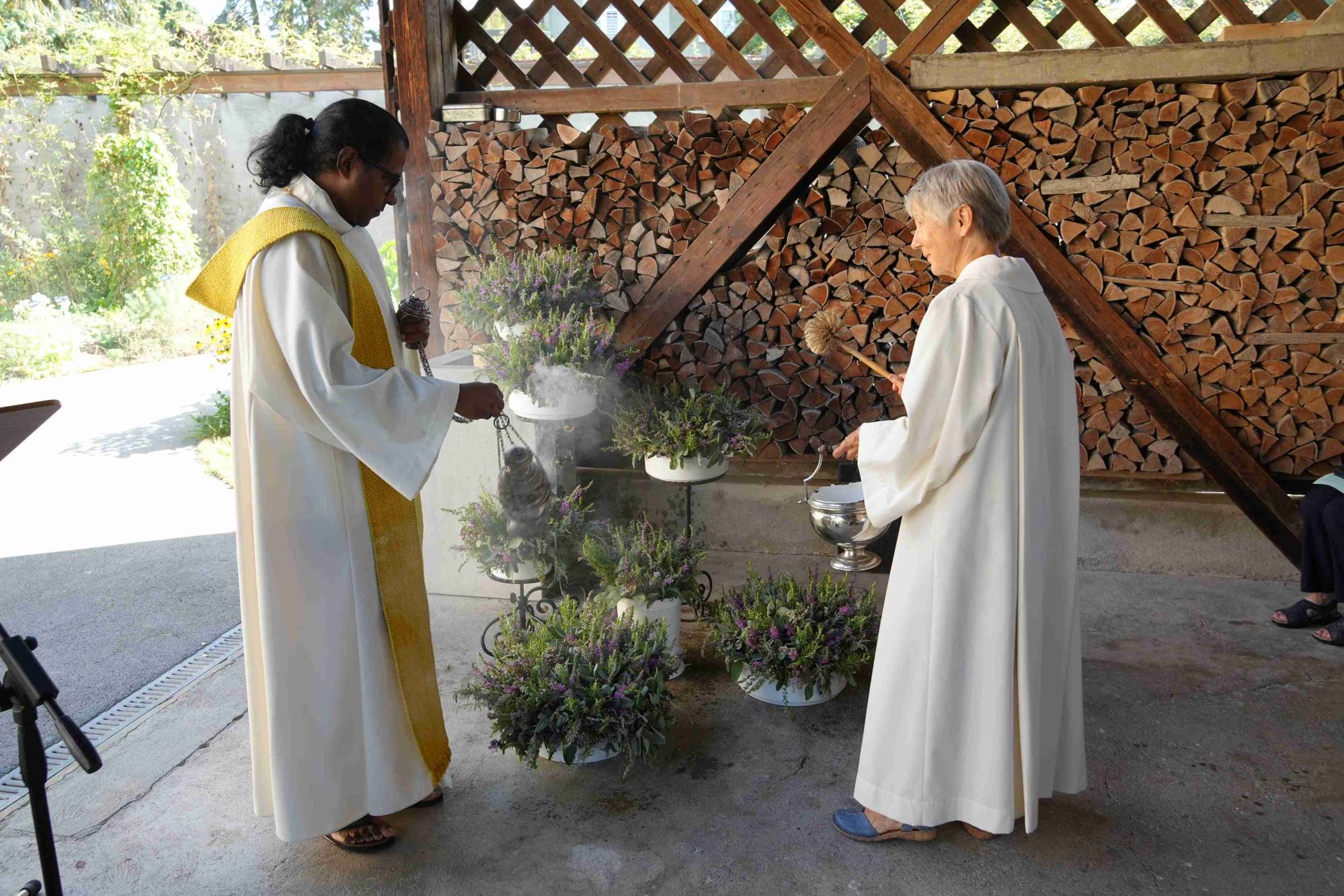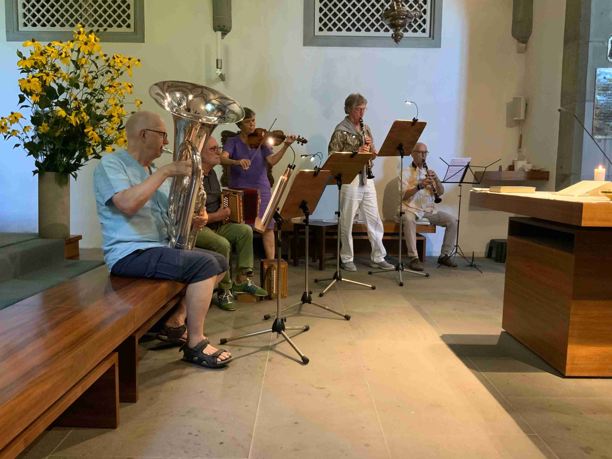 Die Musikgruppe Urisch – Hansruedi Brücker (Klarinette), Fabian Bautz und Kilian Fischer (Tuba), Ruedi Brack (Schweizerörgeli) und Luzia Schaub (Geige) – schenkten uns ein Festprogramm, das Herz und Beine bewegte. Vom schwungvollen Schottisch im Garten-Pavillon über die charmante Mazurka da Barblana aus Graubünden bis hin zu nordischen Klängen wie dem schwedisch-finnischen Stück Emma – die Vielfalt war beeindruckend. Zur Krönung gab es noch den Iria-Tango als Zugabe. Selbst in der Kirche liess man es sich nicht nehmen, einen Tango zu spielen. „Ja, man darf!“, meinte Bruder Paul augenzwinkernd – und stellte sich vor, wie Maria mit Josef im Himmel fröhlich dazu tanzt.