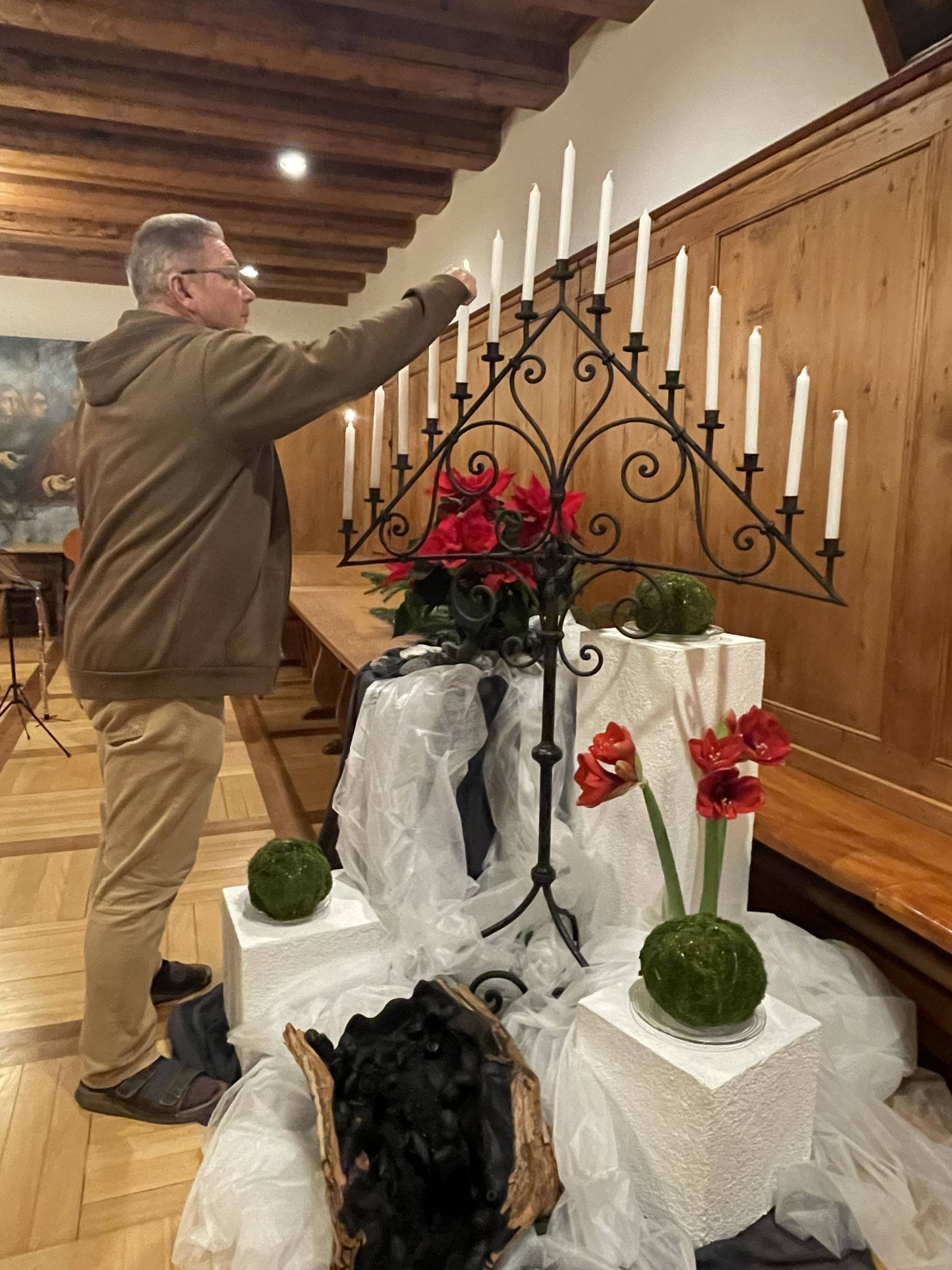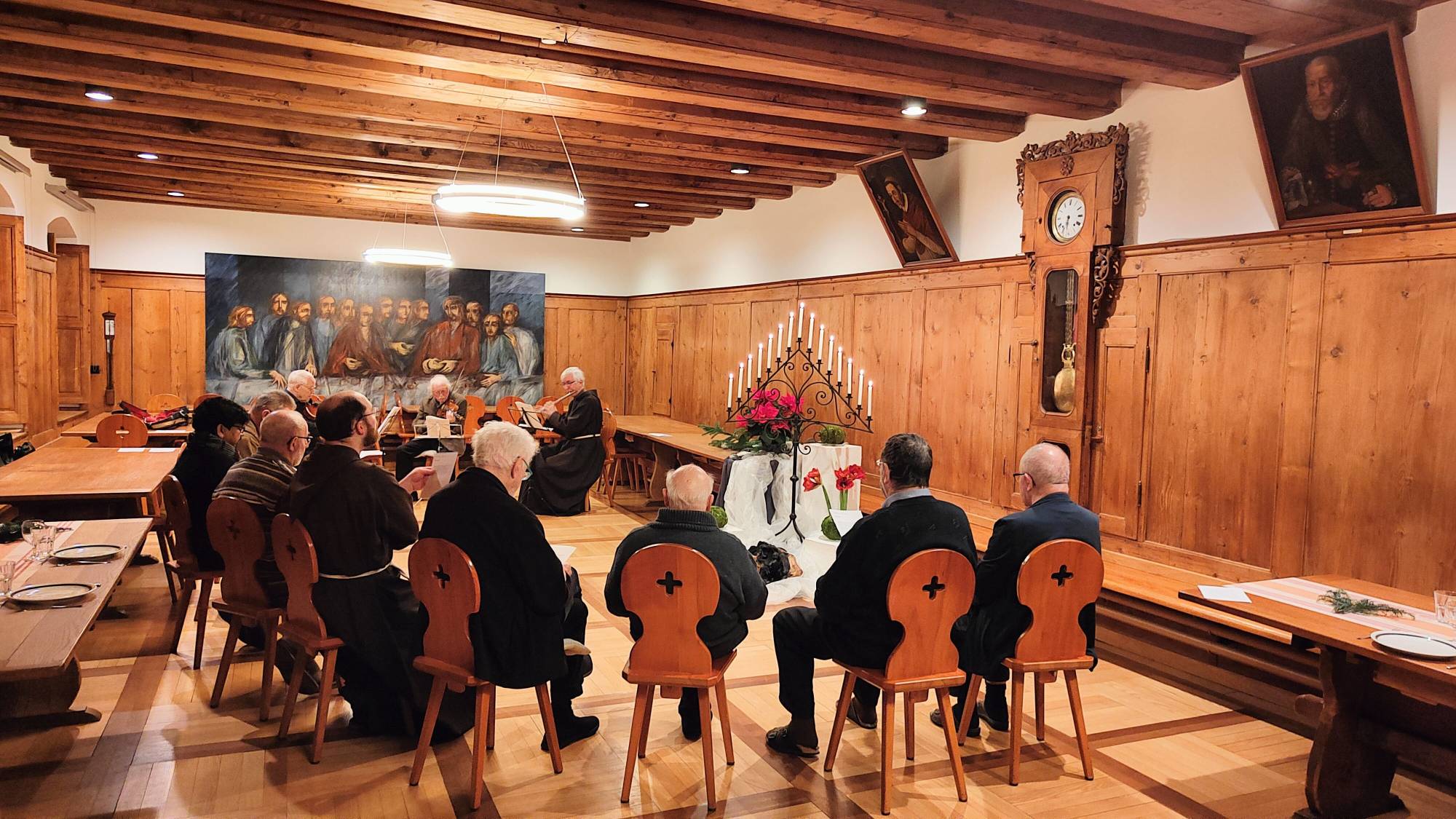 Im festlich geschmückten Refektorium versammeln sich die Brüder vor einer prachtvollen Weihnachtsdekoration. Fünfzehn Kerzen flackern sanft und tauchen den Raum in ein warmes, einladendes Licht. Die Flammen scheinen still zu stehen, als ob sie andächtig lauschen, wie Händels Meisterwerke den Raum durchziehen.