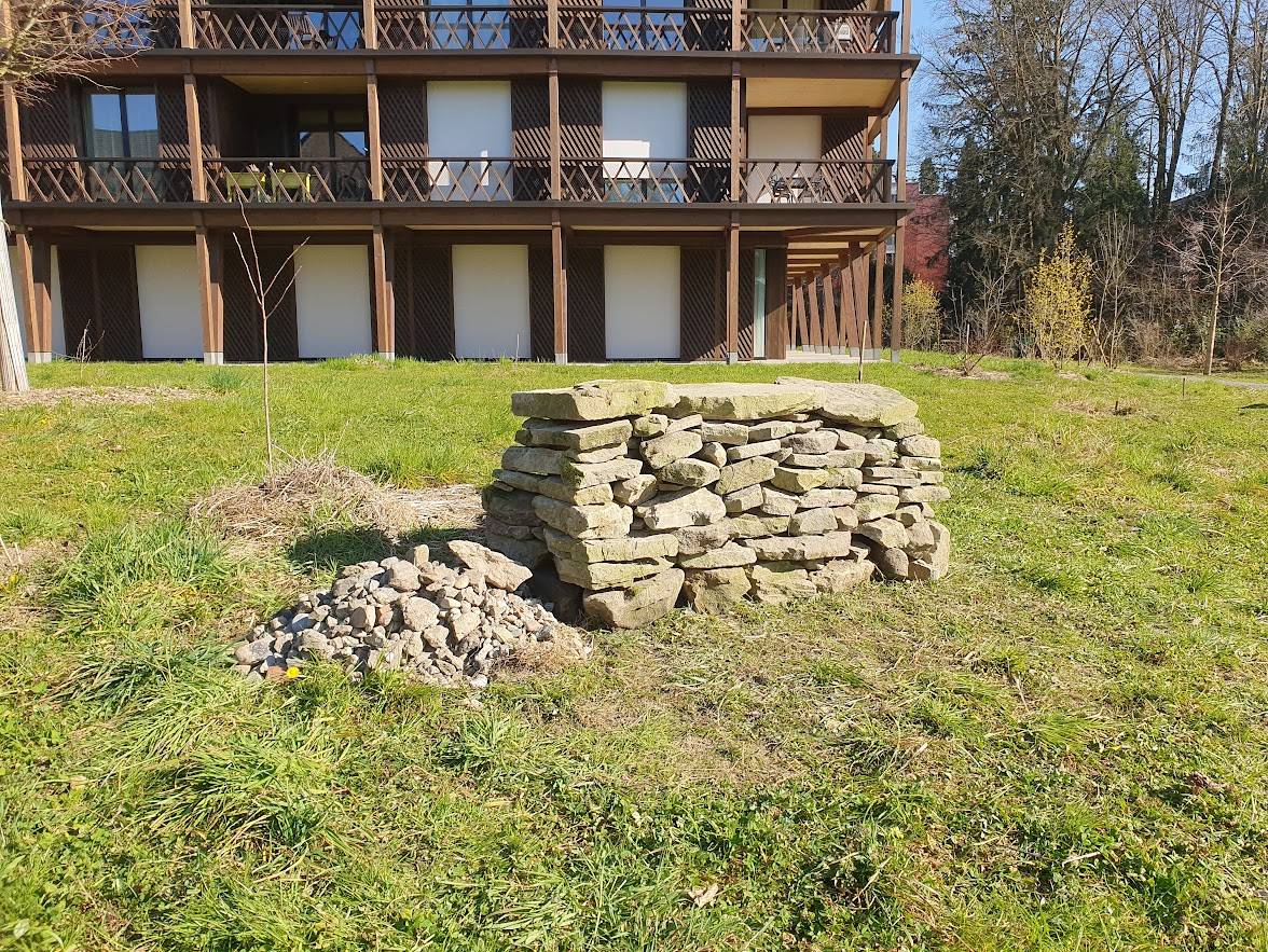 Auch die Bruchsteinmauer, deren Bau am Frühlingsgartentag begonnen wurde, konnte weitergeführt werden. Die aus Sandsteinblöcken entstandene Natursteinmauer wurde fachkundig aus dem Bauaushub geschichtet. Sie bietet wertvollen Lebensraum für Eidechsen und Insekten und setzt zugleich ein Gestaltungselement im Garten.