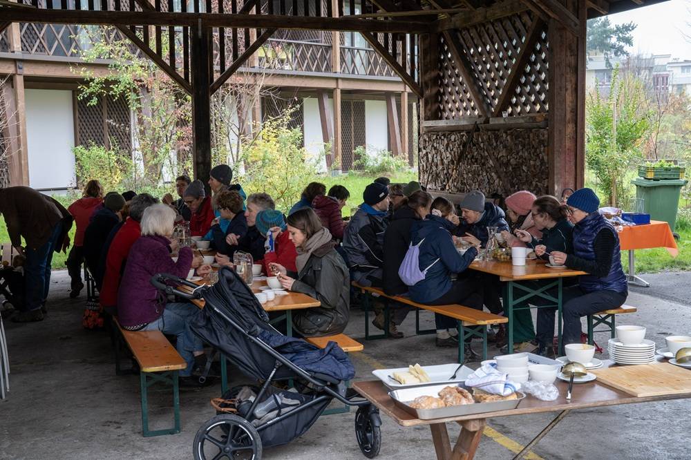 Für Wärme und Stärkung sorgte Moorthy, unser Klosterkoch, mit einer köstlichen Kürbissuppe aus einem grossen Gartenkürbis. Dazu bereicherten wunderbare selbstgebackene Kuchen von ehemaligen und aktuellen Gemeinschaftsgärtnerinnen die Pausen.