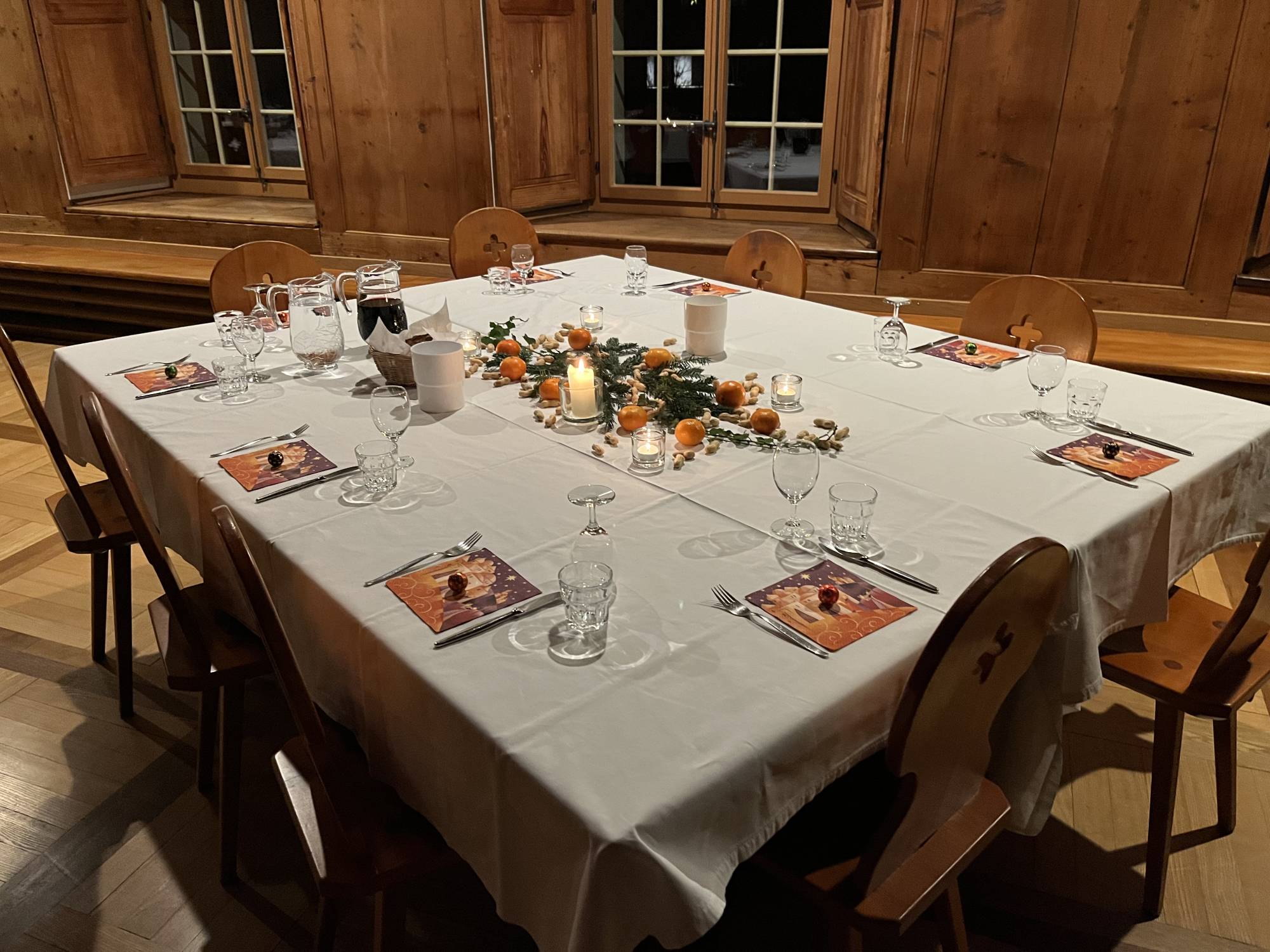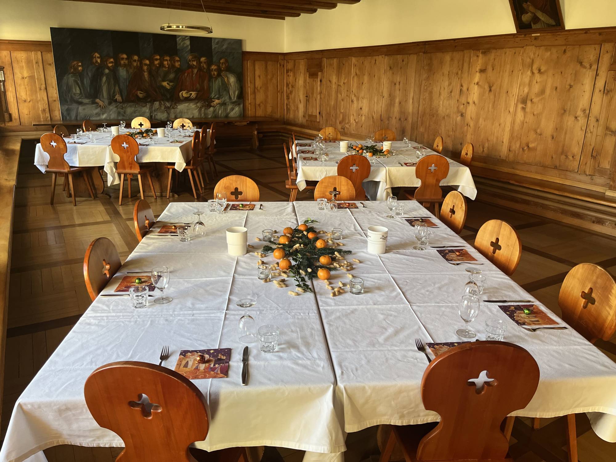 Um 19 Uhr wechselten die Gäste ins Refektorium, wo sie sich an den festlich gedeckten und dekorierten Tischen einen Platz aussuchen durften. Anstelle der langen Tafel in der Mitte hatte das Suppenstubenteam dieses Jahr an vier Doppeltischen für 36 Personen aufgedeckt, und alle Plätze waren besetzt! In den kleineren Gruppen wurde rege geplaudert und diskutiert.